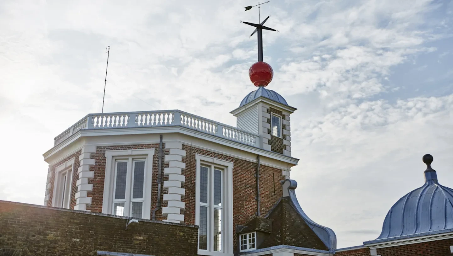 The bright red Time Ball on top of Flamsteed House is one of the world's earliest public time signals, distributing time to ships on the Thames and many Londoners.