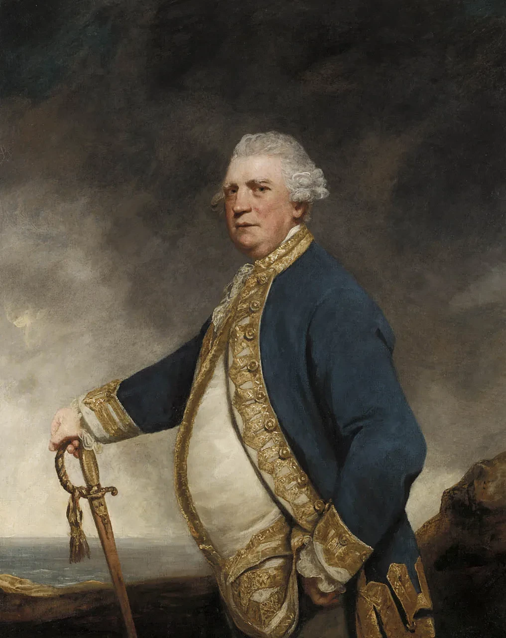 The painting is not dynamic, like Reynolds’s portrait of Augustus Keppel. It has a quiet dignity appropriate for a retirement portrait. Cornewall stands in his wig and naval uniform in front of a plain background.