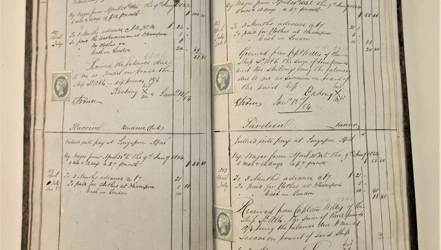 A logbook of St Abbs, a merchant vessel trading between London and East Asia which recruited lascars in the 1850s (RMG reference JOD/145);