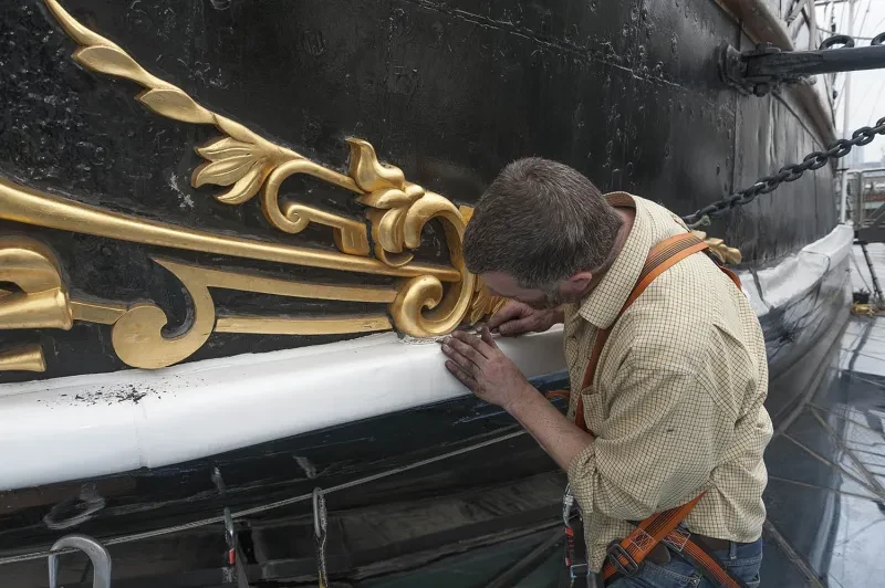 Look around the hull of Cutty Sark and admire the gilded gingerbread. Gilding is a process that was carried out on vessels for centuries and is still practised on Cutty Sark today.